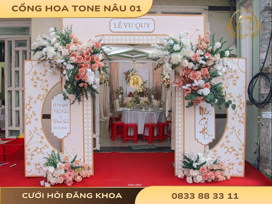 - Điểm nhấn: Có phần in chữ, họa tiết trang trí trực tiếp trên backdrop, giúp cổng vừa là nơi chào đón vừa là phông nền check-in.