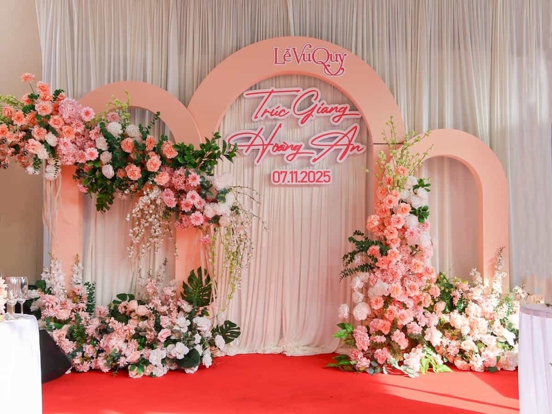 Backdrop vòm lệnh: thiết kế các khung vòm màu hồng nude/cam nhạt xếp lớp, kết hợp hoa tươi cắm tự nhiên, bay bổng. Tên dâu rể được thiết kế font chữ mềm mại, có đèn LED hắt sáng.