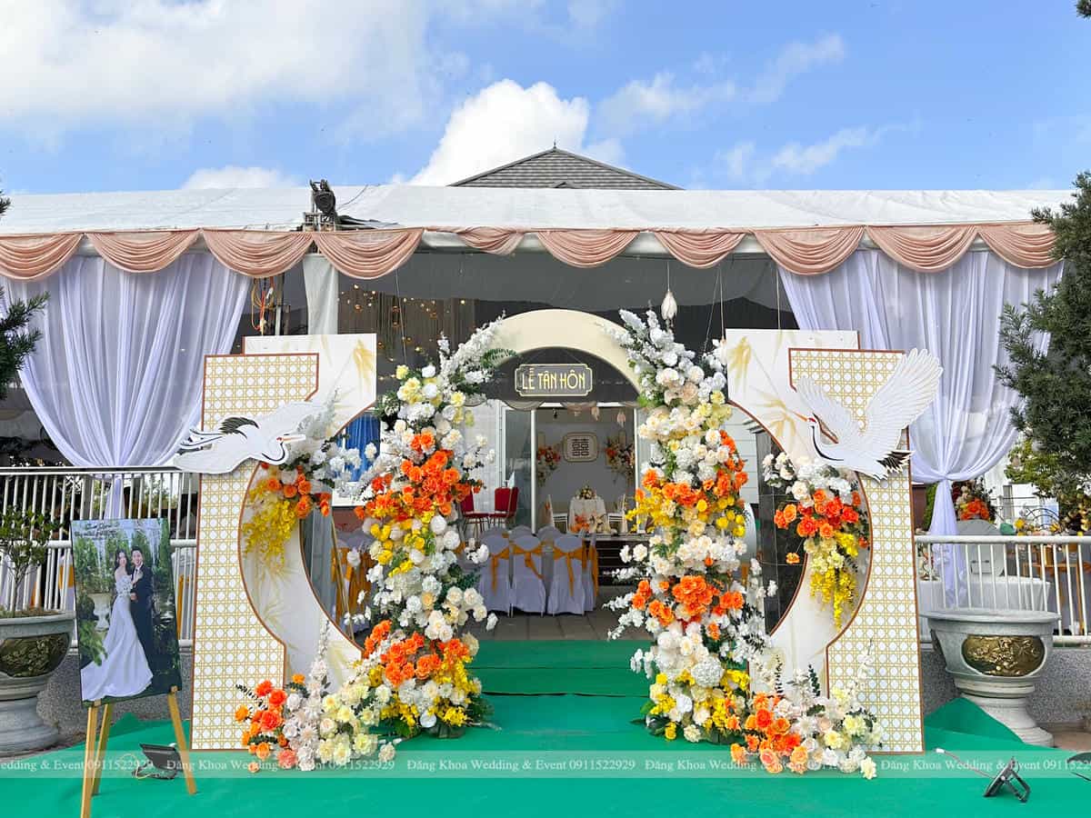 Cổng hoa Song Hạc: thiết kế cổng vuông với vách lưới mắt cáo, điểm nhấn là cặp Hạc Trắng 3D nổi bật giữa các cụm hoa cam. Hạc tượng trưng cho sự trường thọ và gắn bó bền lâu.