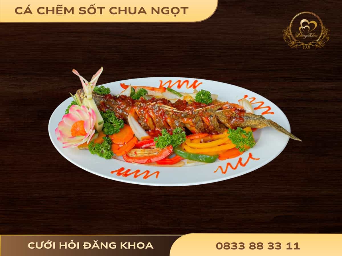 Mô tả: Phần thịt cá chẽm trắng ngần, chắc và ngọt tự nhiên, được chiên giòn, sau đó phủ lớp sốt chua ngọt, vừa cay, vừa ngọt, vừa chua nhẹ.