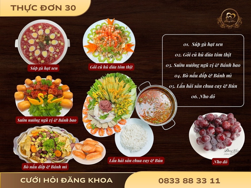Thực đơn 30 mang đến trải nghiệm ẩm thực thanh nhã: Khởi đầu với Súp gà hạt sen bổ dưỡng, tiếp đến là Gỏi củ hủ dừa tôm thịt tươi mát, Sườn nướng ngũ vị kèm bánh bao và Bò nấu đốp cùng bánh mì thơm ngon. Bữa tiệc kết thúc trọn vẹn với Lẩu hải sản chua cay – bún và Nho đỏ ngọt dịu, lựa chọn sang trọng cho những buổi tiệc đáng nhớ.